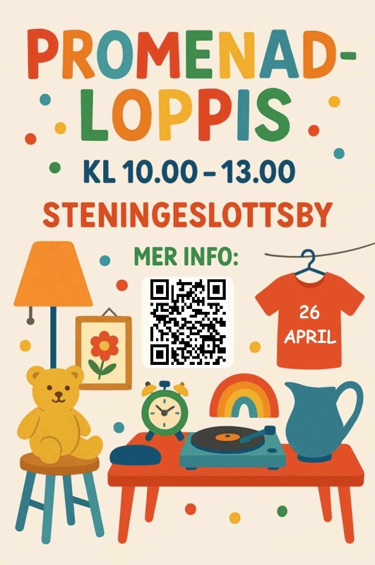 Ta med familjen, vännerna och barnvagnen och kom på en härlig loppispromenad bland gårdar och garage!När? Lördagen den 26 april kl. 10:00 – 13:00 Var? Steningeslottsby – följ kartan och hitta alla loppisstopp! Karta: